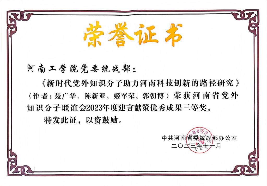 近日,省委统战部下发《关于河南省党外知识分子联谊会2023年度建言献策优秀成果的通报》,我校党外知识分子联谊会副会长、无党派人士、图书馆馆长聂广华教授主持完成的《新时代党外知识分子助力河南科技创新的路径研究》获建言献策优秀成果三等奖。